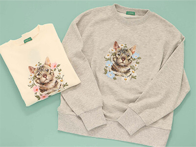 細かい毛並みまで描かれており、周りのフラワー刺繍で華やかさも感じられる大人っぽい1枚です。